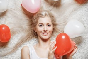 Woman holding heart shaped balloons