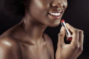 Beautful African woman applying red lipstick