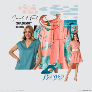 Complementary Colours are on opposite sides of the Colour Wheel. Coral and Teal are variations of the hues of orange and pink and also green and blue respectively.
